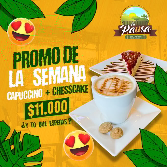 ¡Dale sabor a tu semana! ☕🍰 Disfruta de la combinación perfecta: un delicioso Cappuccino ☕ y un irresistible Cheesecake 🍰 por solo $11,000. 😋 ¡Ven y consiéntete con nuestra promo de la semana! 🎉✨
